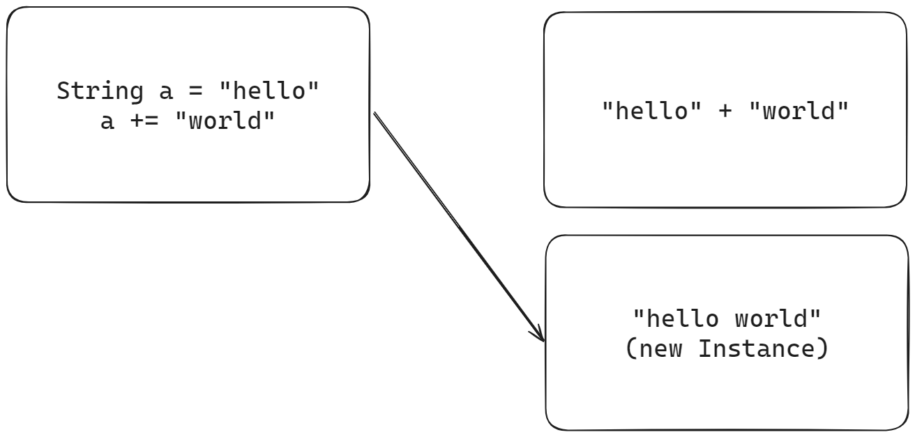 String은 불변(immutable) / StringBuilder와 StringBuffer는 가변(mutable)이다. String 인스턴스를 생성하면 변수의 타입이 final 이기 때문에 변경이 불가능하다. 따라서 우리가 + 연산자로 데이터를 업데이트 하는 것처럼 보이는 것은 기존 데이터 a에 새로운 데이터 b를 합치는 것이 아니라 a+b를 합친 새로운 데이터를 생성하는 것이다.