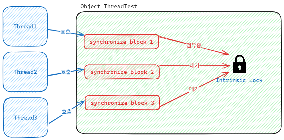 고유락 개수!= synchronize 블럭 개수의 개념이며 고유락은 객체 당 하나만 존재하기 때문이다. 따라서 어떤 synchronize 블럭을 호출하던 간에, 호출한 스레드는 고유락을 점유하게 되고 점유가 끝날 때까지 다른 스레드의 작업이 불가능한 것이다.