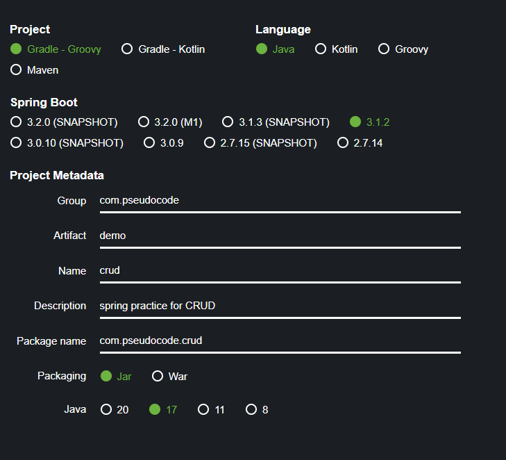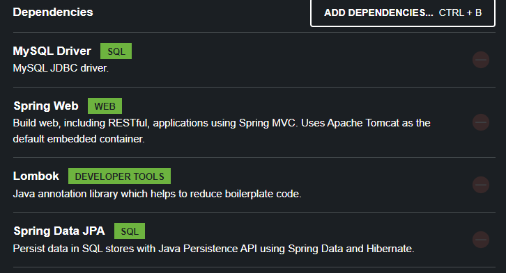 Dependencies는 CRUD 구현을 위한 Spring Web, Lombok, DB도 연결할거라 MySQL Driver를 설치했다. 그리고 나중에 JPA 연습할 것도 고려해서 Spring Data JPA를 넣었다. 개발 목적에 따라 필요한 의존성을 추가해주자.