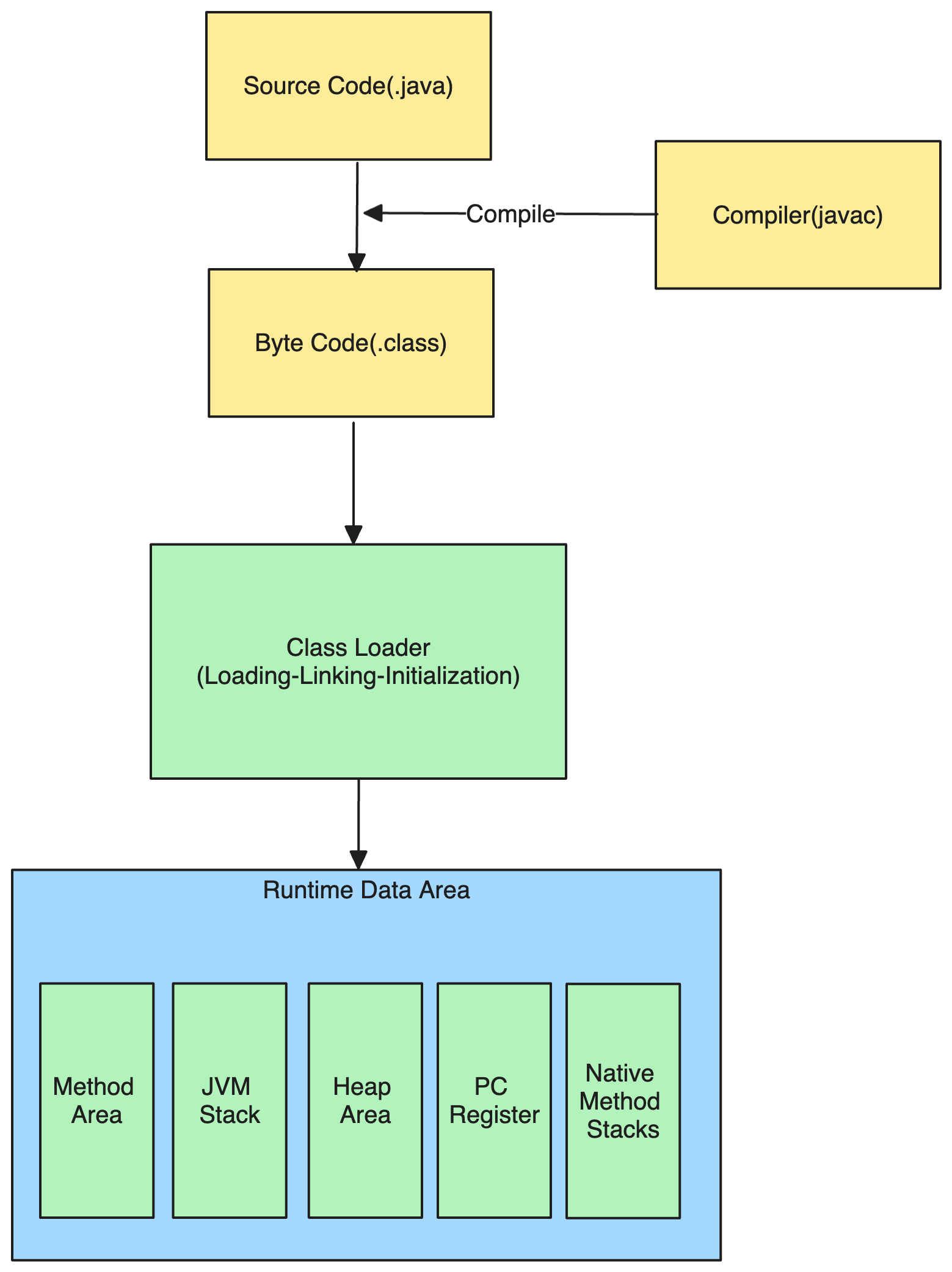 JVM에서 자바 애플리케이션을 실행하기 위해서는 소스 코드가 컴파일러를 통해 바이트 코드로 변환되고, 변환된 바이트 코드는 클래스 로더를 통해 JVM 내부의 메모리 영역에 저장되는 과정을 거친다.