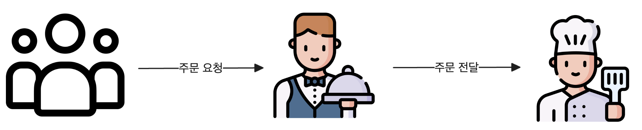 손님이 웨이터를 통해 주문을 하고 웨이터는 주문을 받아 요리사에게 전달하는 상황이라고 가정해보자.