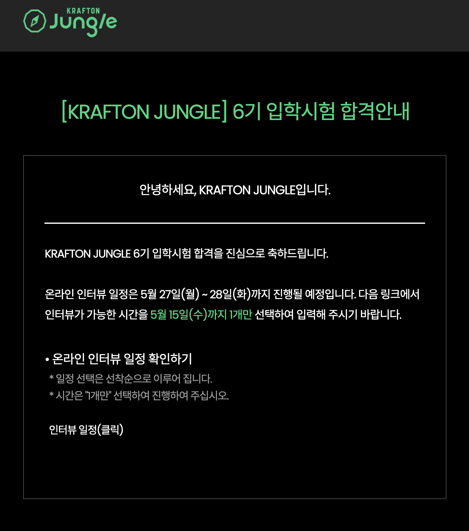사실 면접 끝나고 아쉬운 마음에 크래프톤 정글 탈락/불합격 후기를 좀 찾아봤는데, 카이스트 정글은 후기가 좀 있었는데 크래프톤 정글은 후기가 없었다. 크래프톤 정글의 지원자격에는 4년제 대졸이라는 허들이 없기도 하고, 제 뇌피셜로 상대적으로 선발에 있어서 너그러운 것 같습니다. 결론은 면접까지 봤으면 너무 마음 졸일 필요는 없지... 않을까 하는 생각이 듭니다.