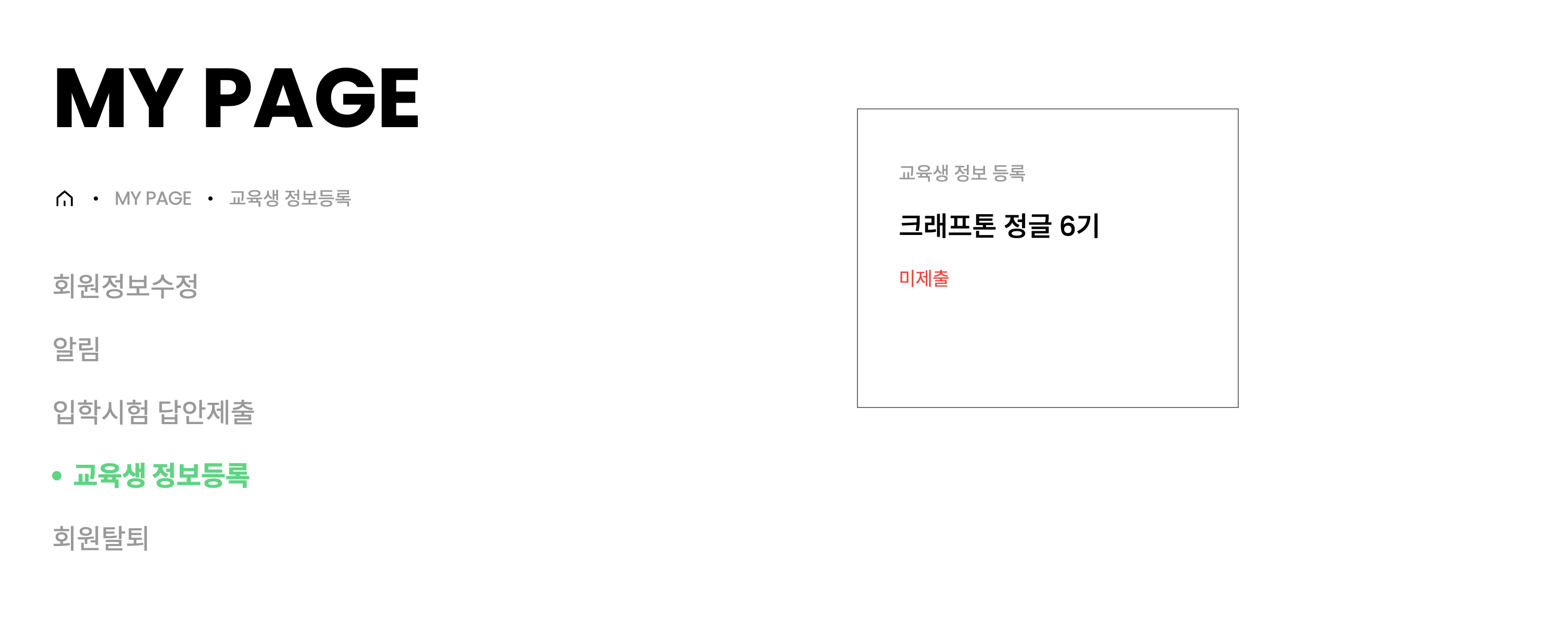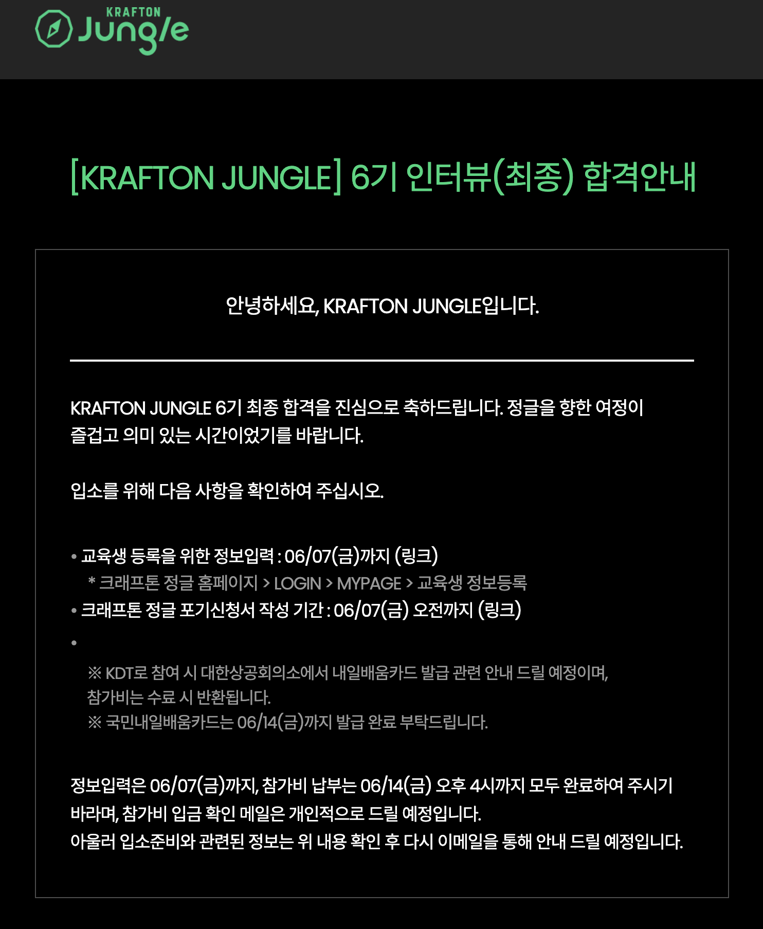 정글은 당연히 떨어졌다고 생각하고 생각하고 듣던 김영한 강의를 마저 듣고 네부캠 자소서를 쓰고 있었다. 그래도 혹시 몰라서 발표일 당일 00시에 크래프톤 정글 홈페이지에 들어가 보니 마이페이지에 교육생 정보등록 카테고리에 정보 등록 페이지가 떠 있었다. 떨어진 사람한테 굳이 왜 이걸 띄워주지..? Hoxy... 나 합격..?이라고 생각하며 잠에 들었다.