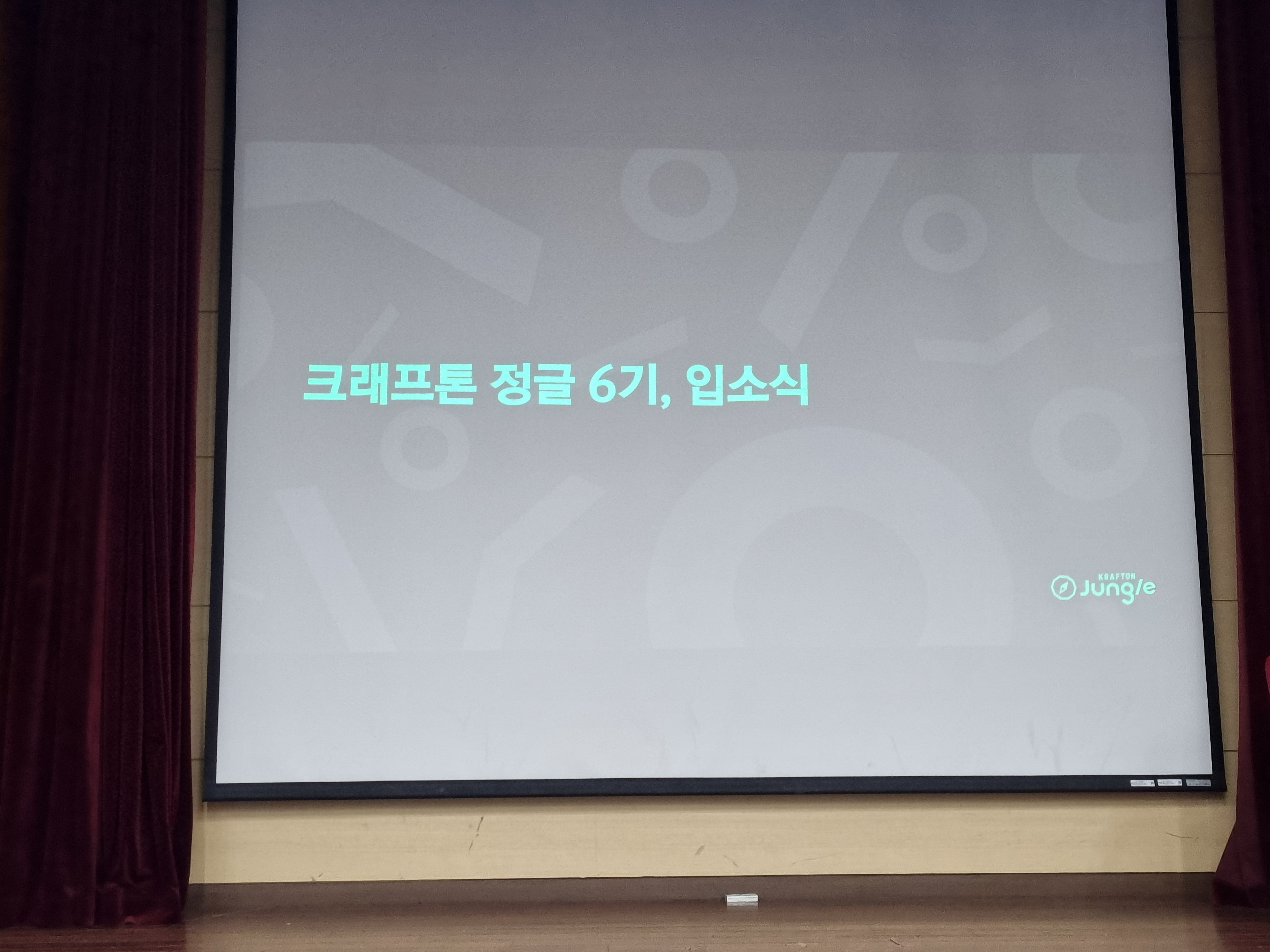옷 받고 기숙사 식당에서 룸메랑 점심 먹고 강당으로 이동해서 입소식 진행했습니다. 4일 지난 시점에서 입소식이 내용이 잘 기억은 안 나는데 요약하자면 정글이 어떤 곳인지, 무엇을 배울 수 있는지, 운영진 및 코치님들의 자기소개와 FAQ, 그리고 시간 상의 이유로 직접 오시지는 못했지만 크래프톤 장병규 의장님의 영상을 통한 환영 인사가 있었습니다.