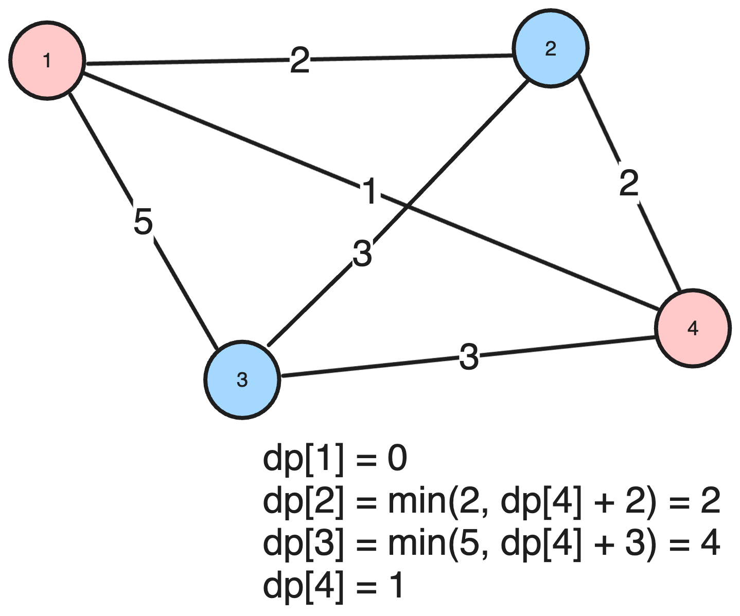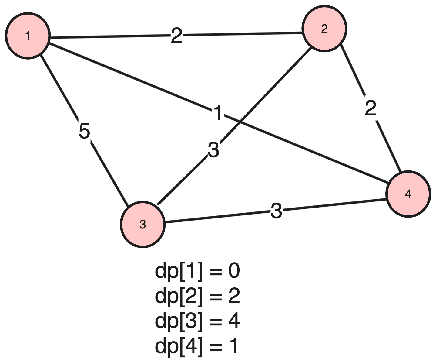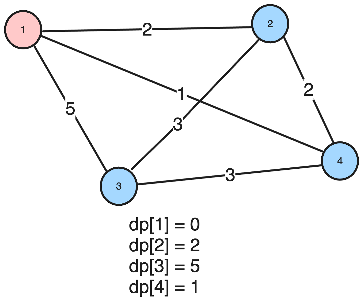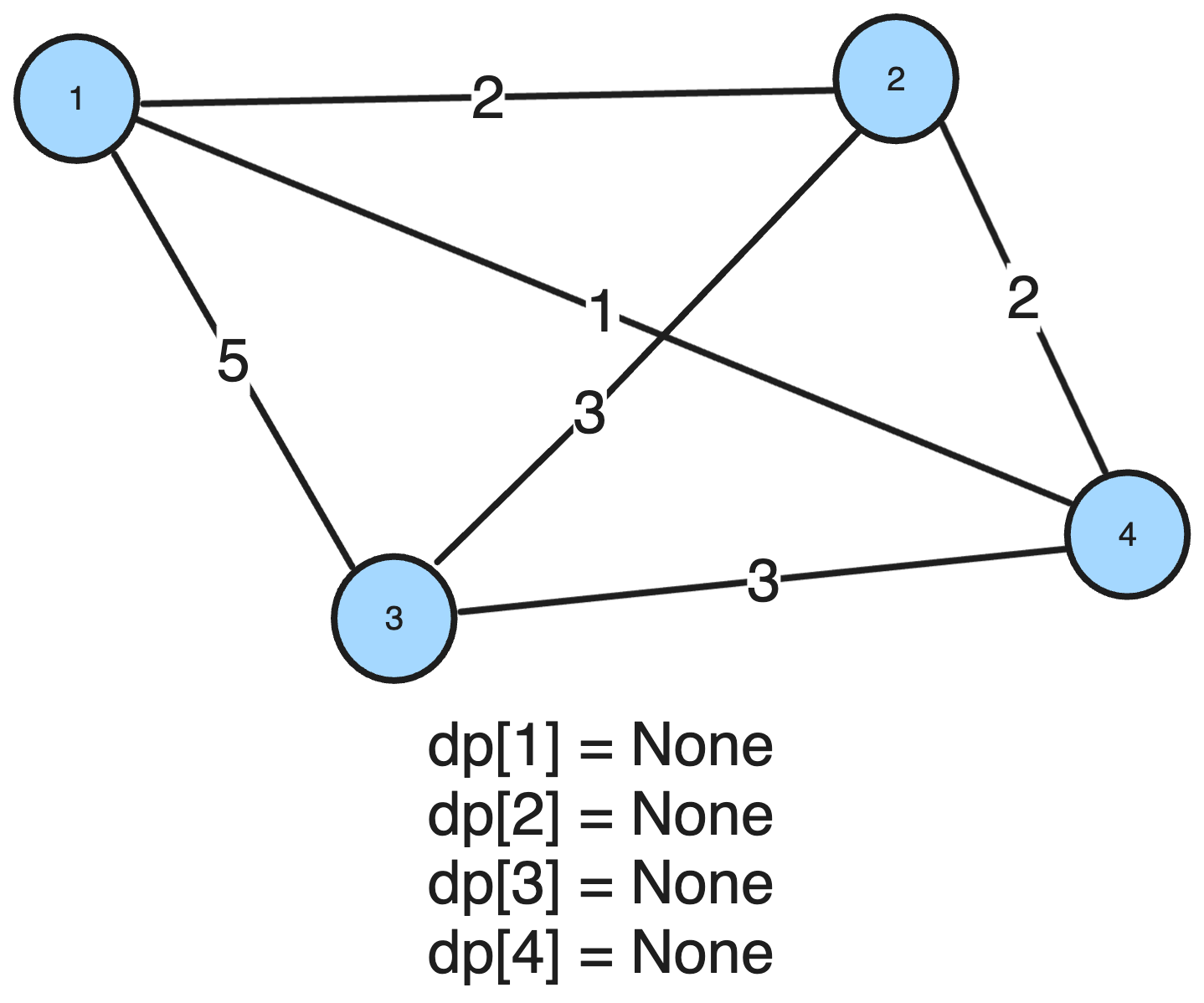 graph = [[], [0, 0, 2, 5, 1], [0, 2, 0, 3, 2], [0, 5, 3, 0, 3], [0, 1, 2, 3, 0]]