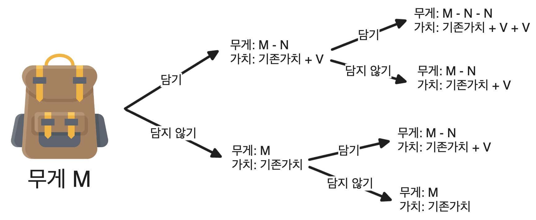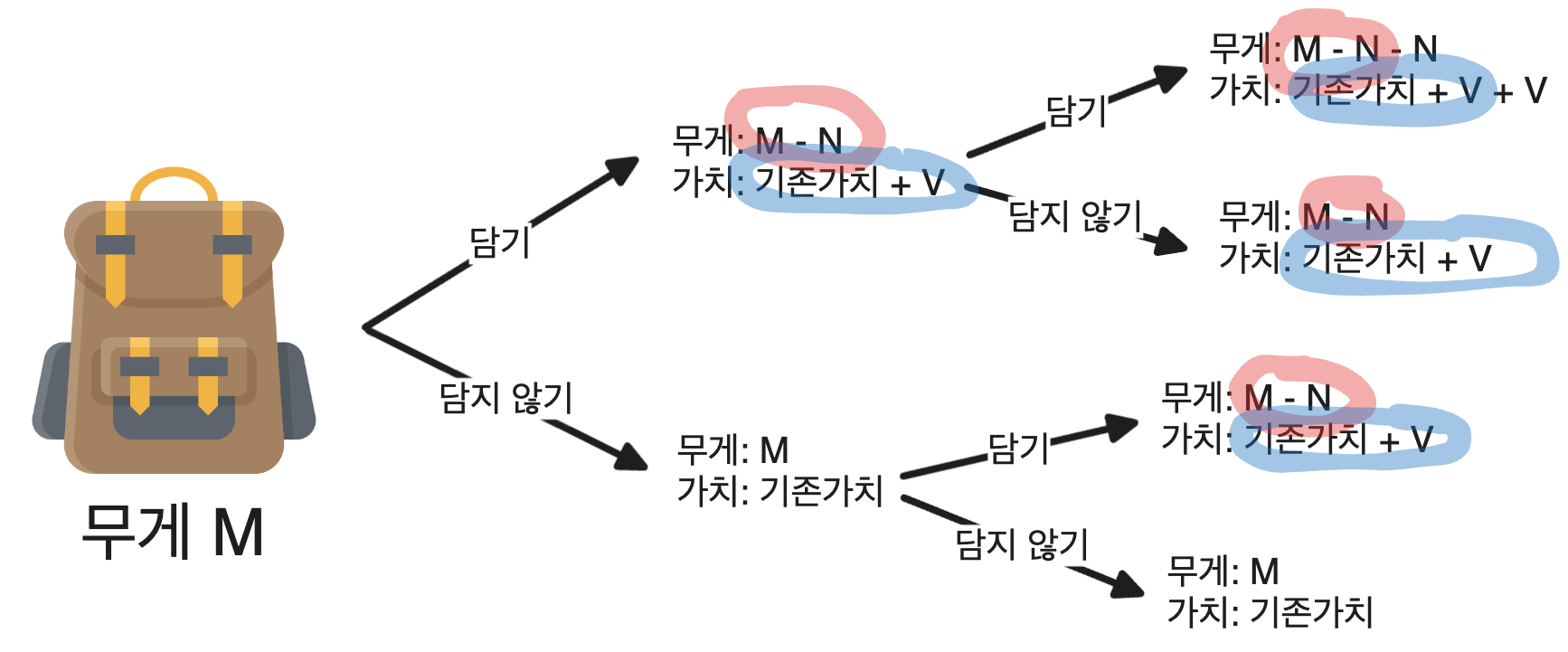 용량이 M, 가치가 0인 배낭에서 N개의 물건을 넣으면 용량이 M-N, 가치가 V인 배낭이 되는 것으로 생각하면 쉽습니다.