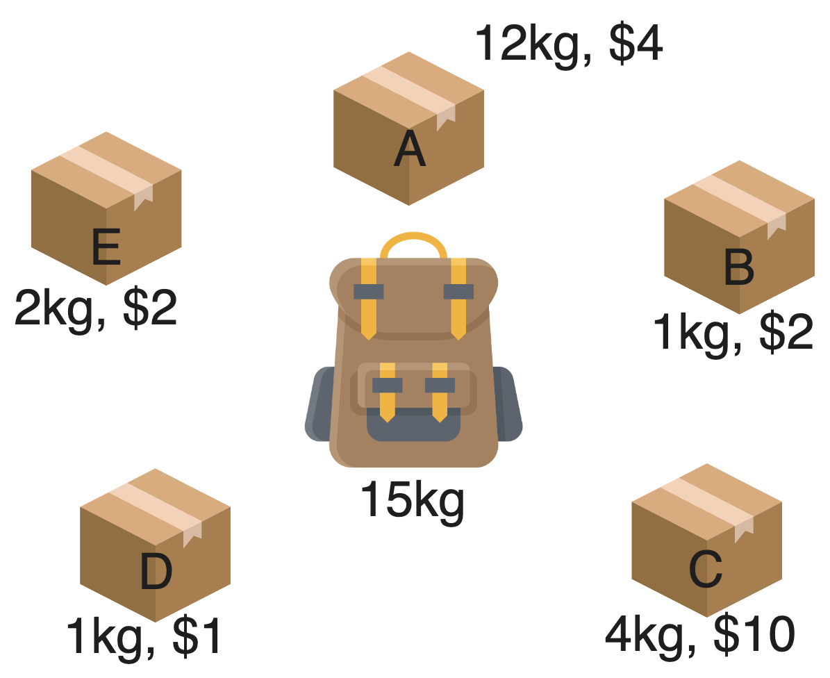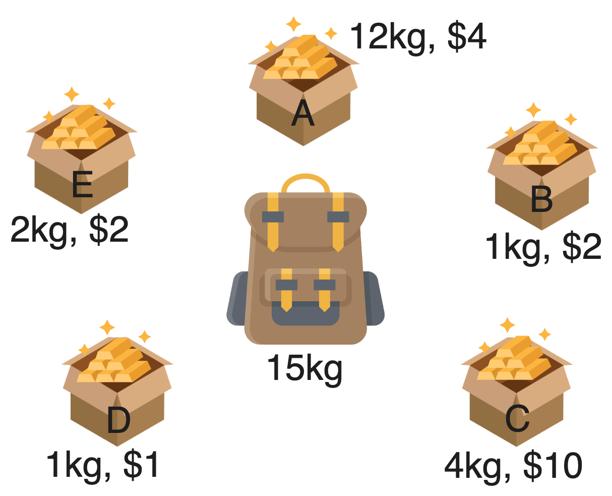 아래와 같은 15kg를 담을 수 있는 배낭, 그리고 열 수 있는 상자에 각각 금괴가 담겨있는 상황을 고려해 봅시다. 배낭의 무게 한도를 초과하지 않으면서 담는 금괴의 가치합을 최대화하기 위해서는 상자의 금괴 kg당 가치를 고려해야 할 것입니다.