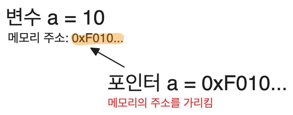 변수 a의 메모리 주소가 0xF010... 이라고 하면 해당 메모리 주소를 값으로 가지는 것이 바로 포인터입니다. 즉 메모리 주소를 가리키는 변수가 바로 포인터인 것이죠.