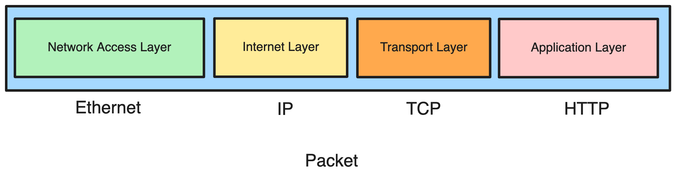 2. 요청을 인터넷을 통해 구글서버로 전달하기 위해 패킷을 만듭니다. 이 때 패킷에는 각 계층(Application Layer, Transport Layer... 등)에 필요한 정보들이 담깁니다.