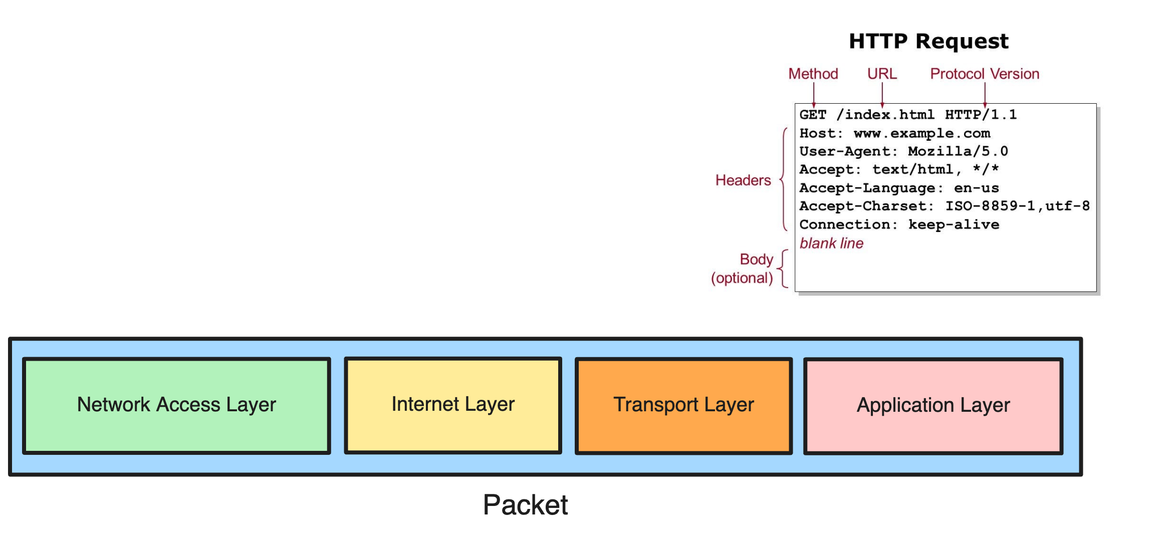 3. 패킷의 Application Layer에는 HTTP Request가 들어갑니다.